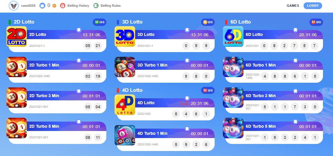Lucky9999 นำเสนอเกมลอตเตอรีหลากหลายรูปแบบ เช่น 2D, 3D, 4D และ 6D โดยแต่ละเกมจะมีรูปแบบการเล่นและตัวเลือกในการชนะที่แตกต่างกันออกไป